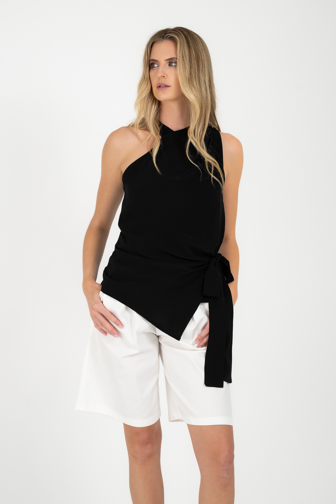 Ασύμμετρο τοπ με φυσική κίνηση και ισορροπία που αγκαλιάζει το σώμα διακριτικά. Σε ελαφρύ ύφασμα με απαλή υφή και δέσιμο στο λαιμό και στο πλάι.