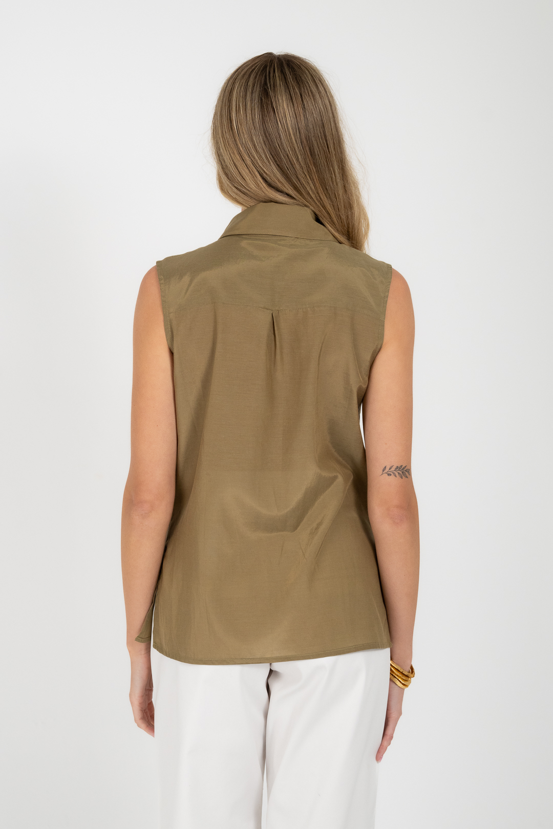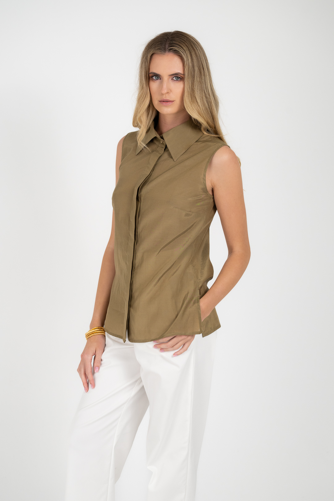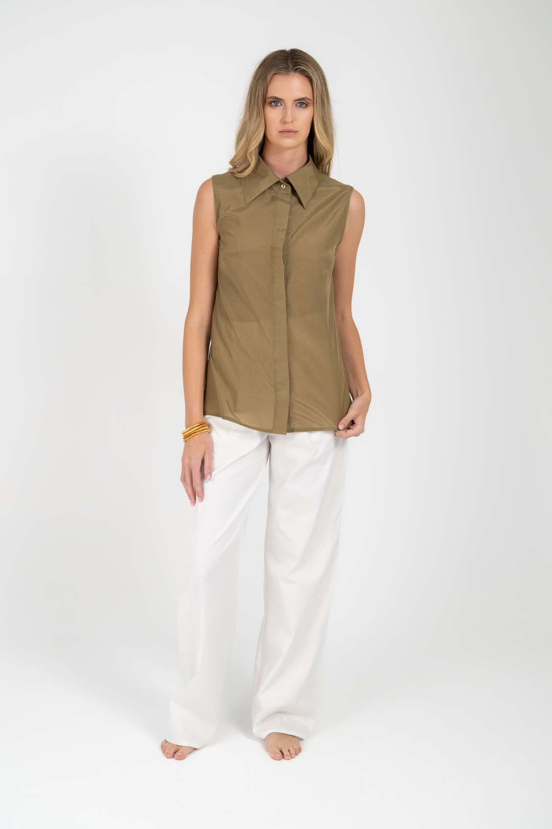 Sleeveless shirt with a classic collar and discreet front closure. Straight line and lightweight fabric with a soft texture that offers natural movement and comfort.