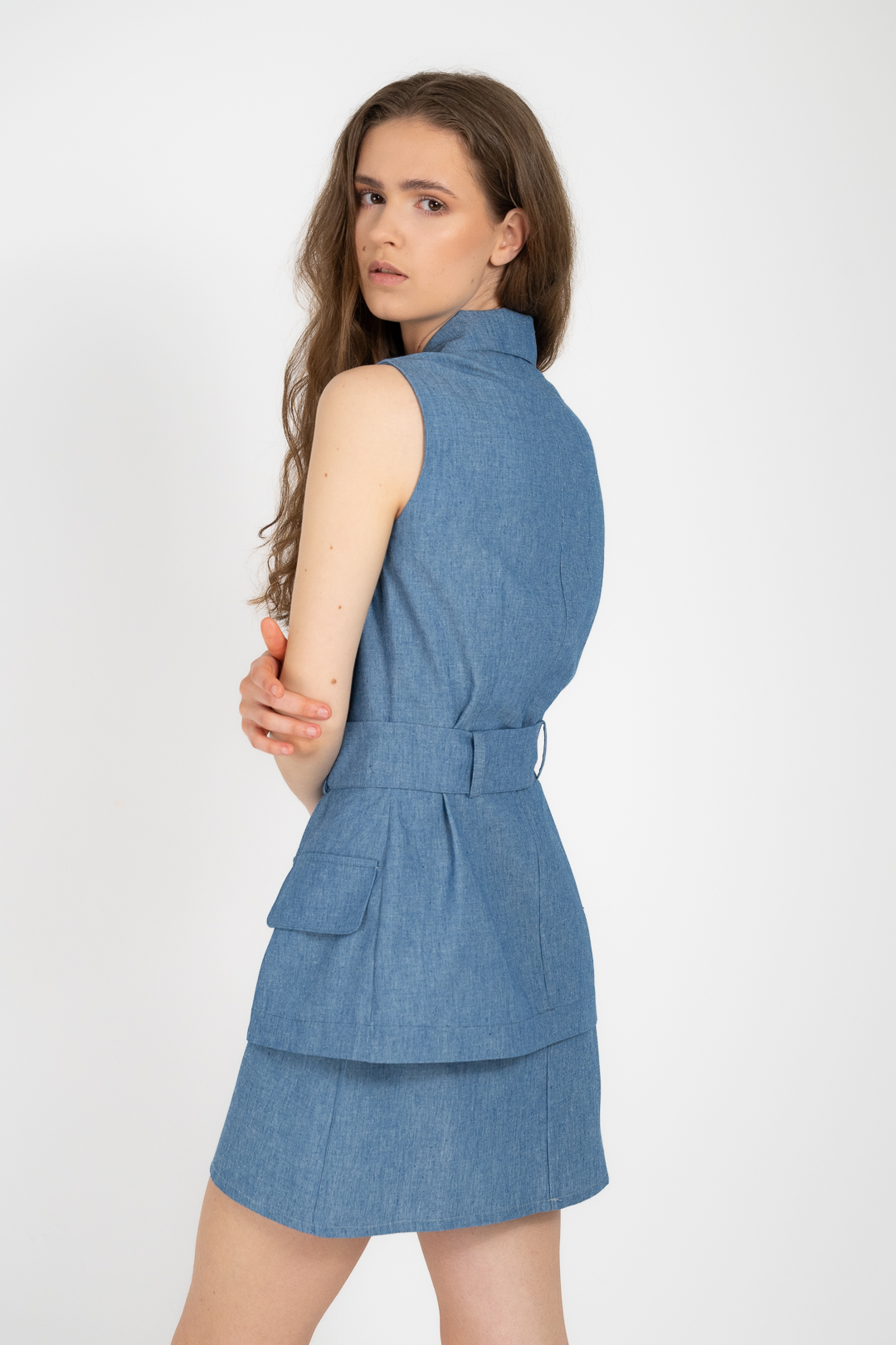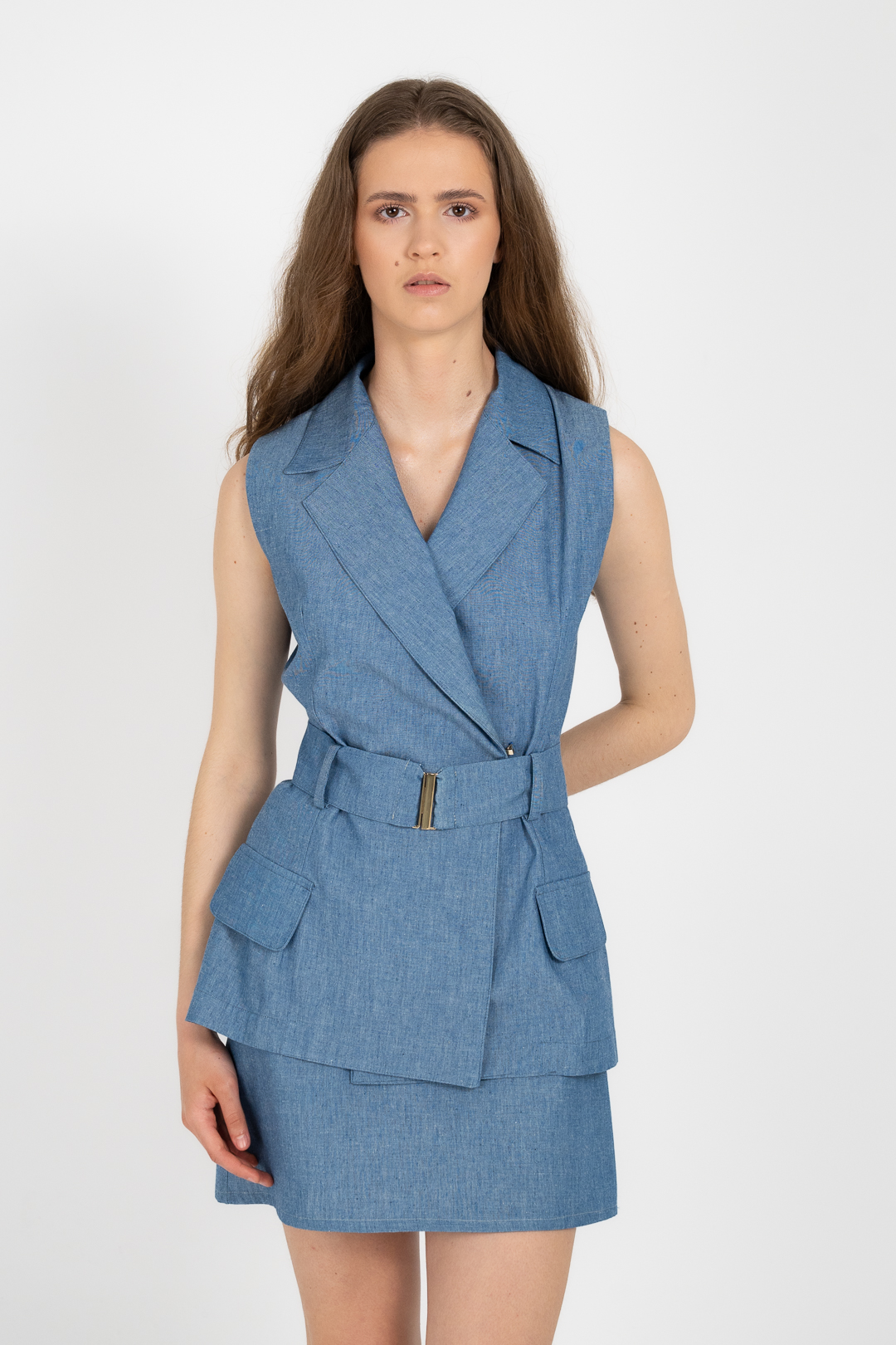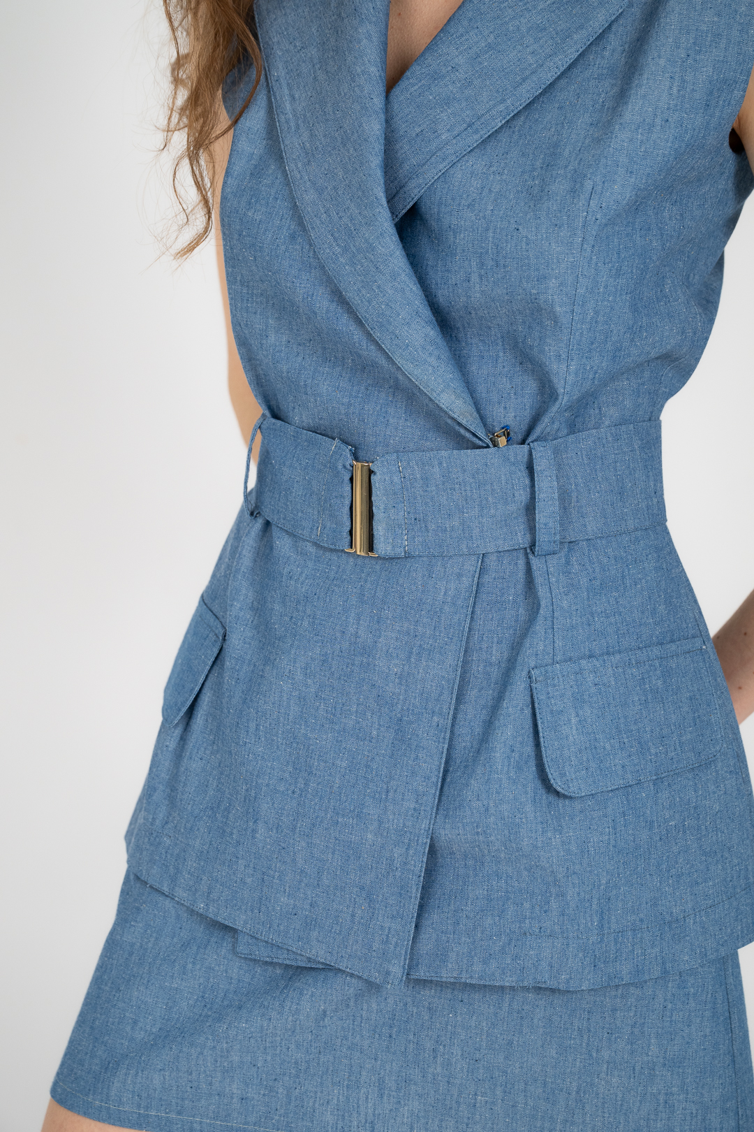 Τζιν γιλέκο με καθαρή, δομημένη γραμμή και άψογη εφαρμογή. Διαθέτει πέτο γιακά και ζώνη στη μέση που τονίζει τη σιλουέτα. Απο σταθερό denim ύφασμα με ελαφριά ελαστικότητα για άνεση στην κίνηση.