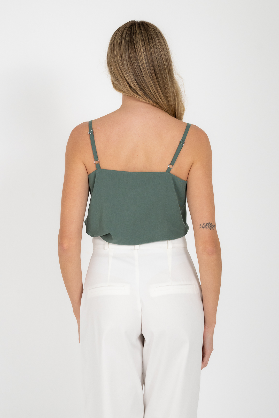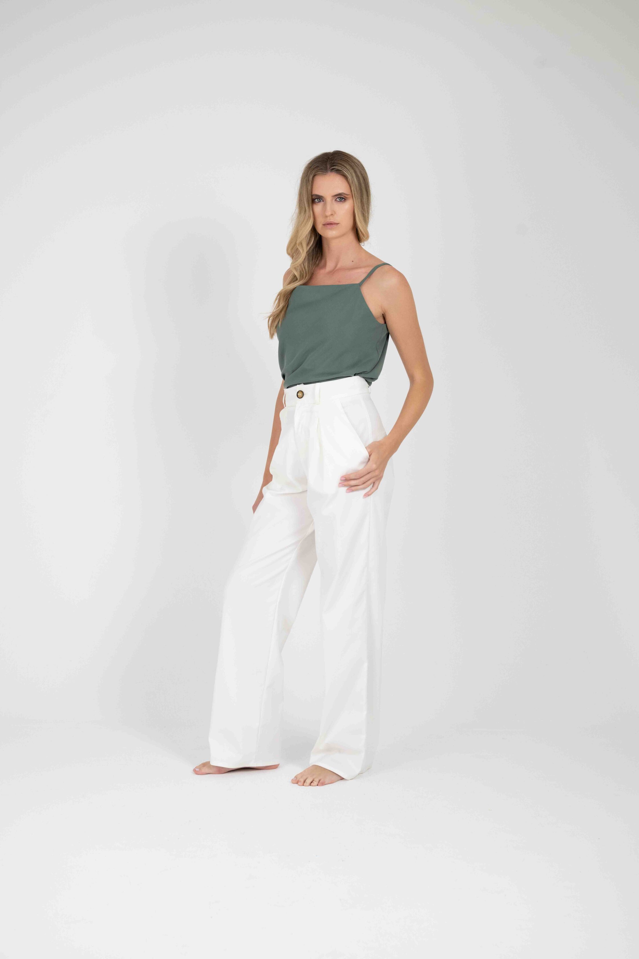 High-waisted pants with pleats, a clean line and a firm fit. The fabric maintains its shape, offering a balanced and neat fit.