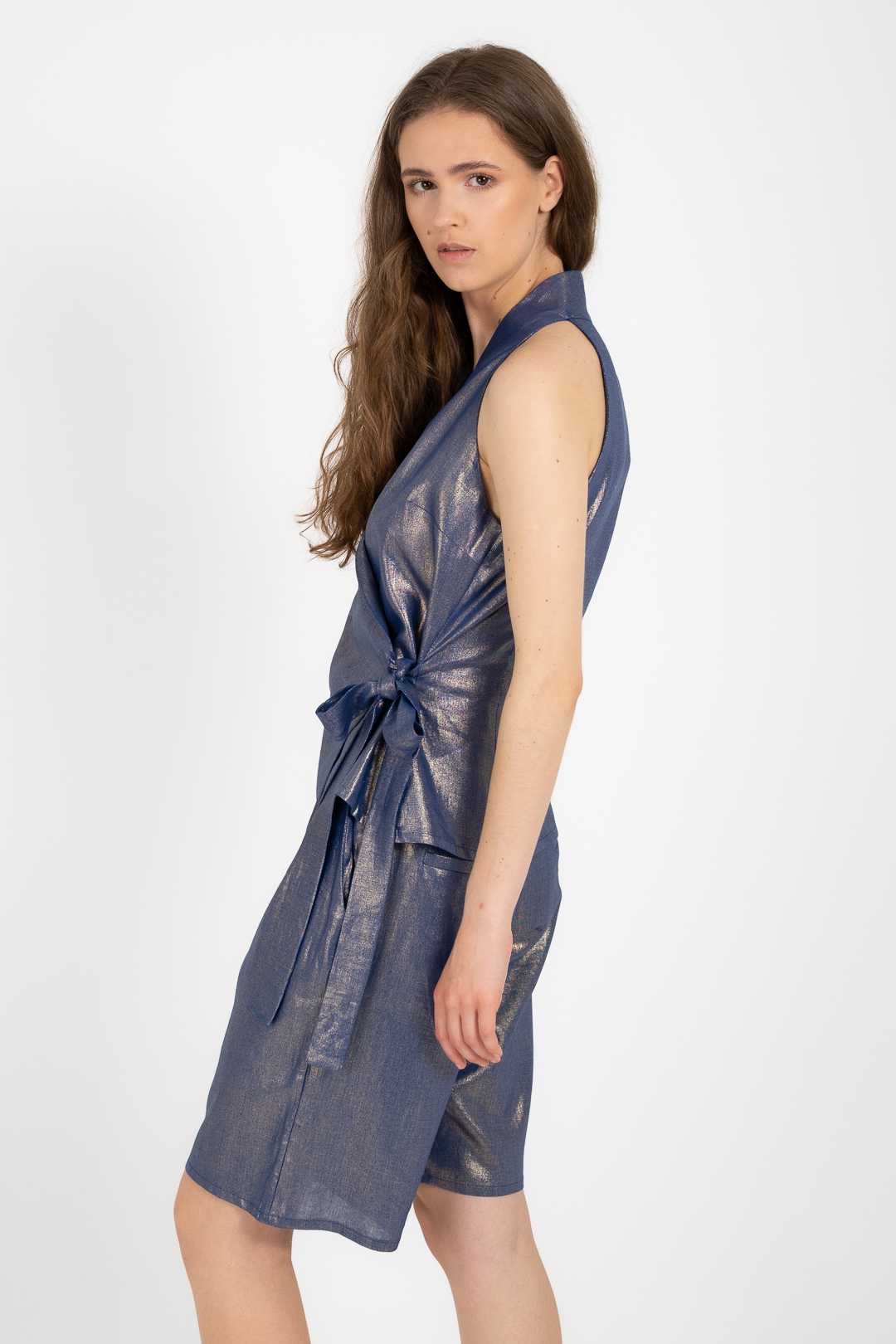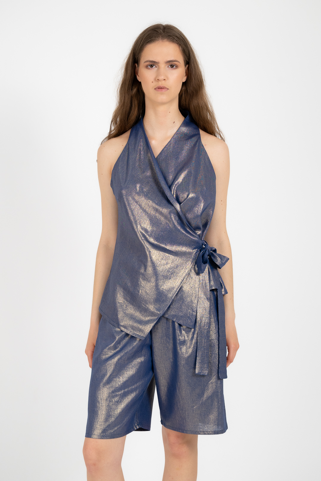 Ασύμμετρο τοπ με δέσιμο στο πλάι και ιριδίζουσα ίνα σε μπλε απόχρωση που χαρίζει διακριτική λάμψη.  Από ύφασμα bamboo και λινό για δροσερή αίσθηση και φυσική κίνηση.  Συνδυάζεται αρμονικά με τη βερμούδα  Mythos Bermuda.