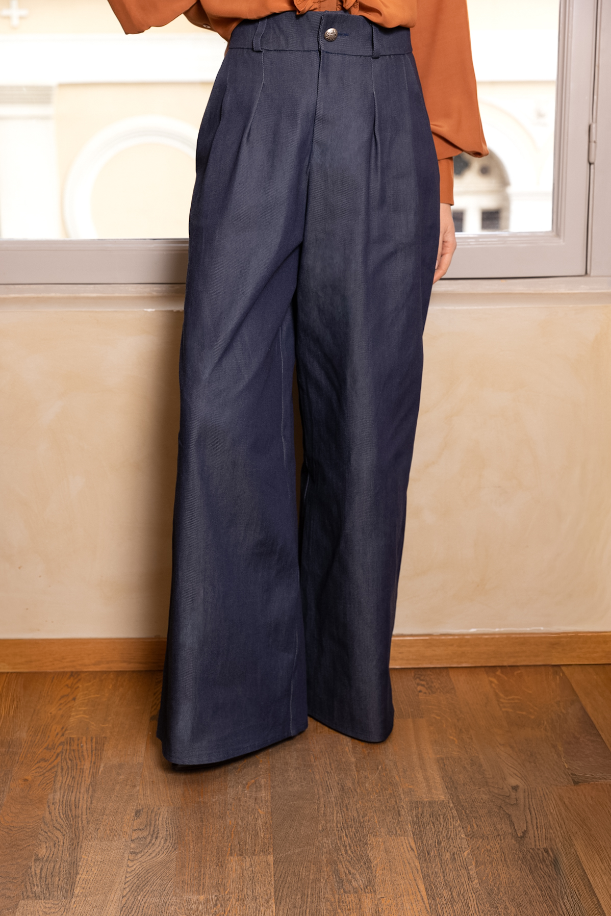 Παντελόνι wide-leg από denim twill με σύνθεση lyocell και βαμβακιού. Το ύφασμα συνδυάζει μαλακή υφή, φυσική λάμψη και ανθεκτικότητα. Οι πιέτες αναδεικνύουν τη μέση και προσφέρουν άνεση στην κίνηση.