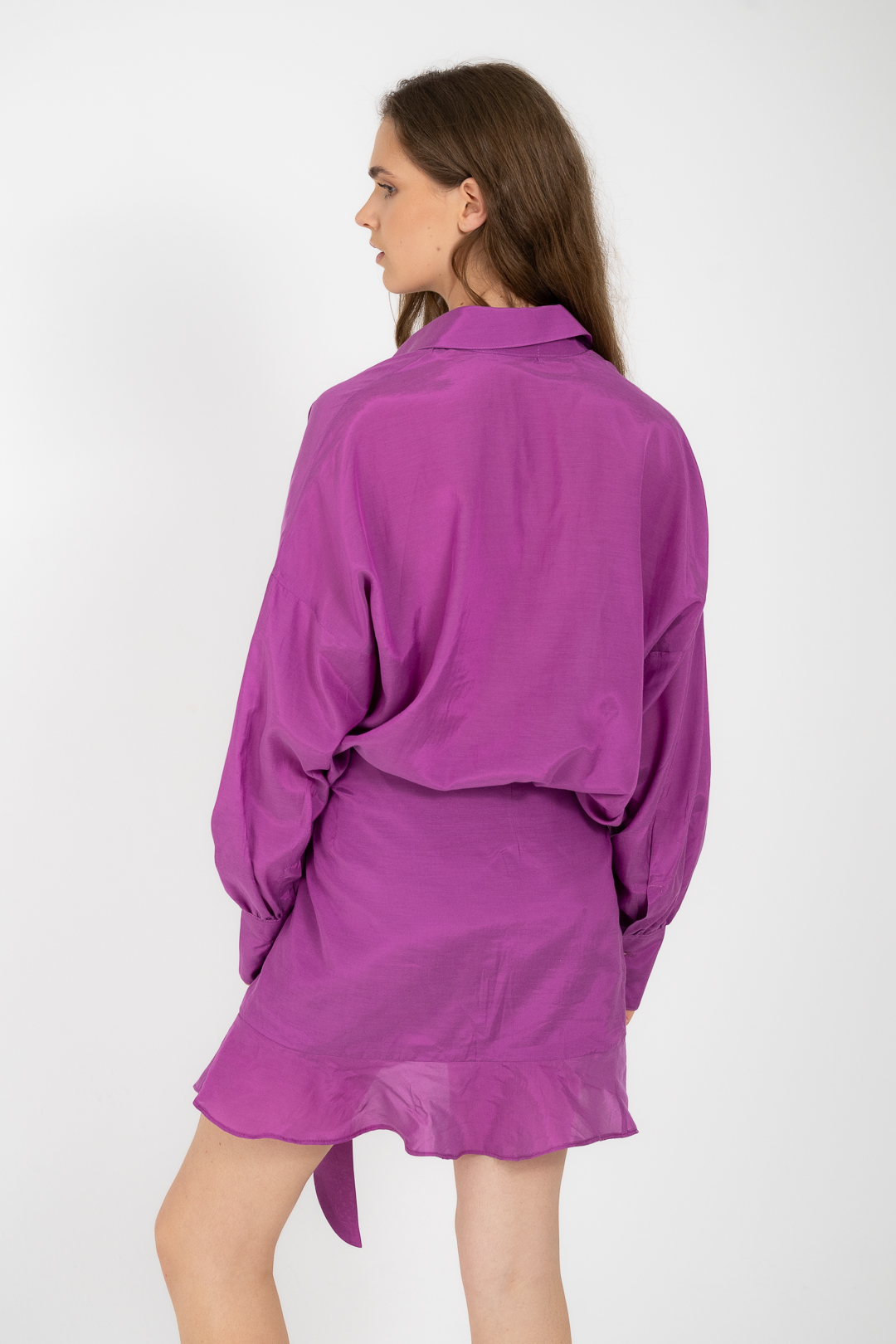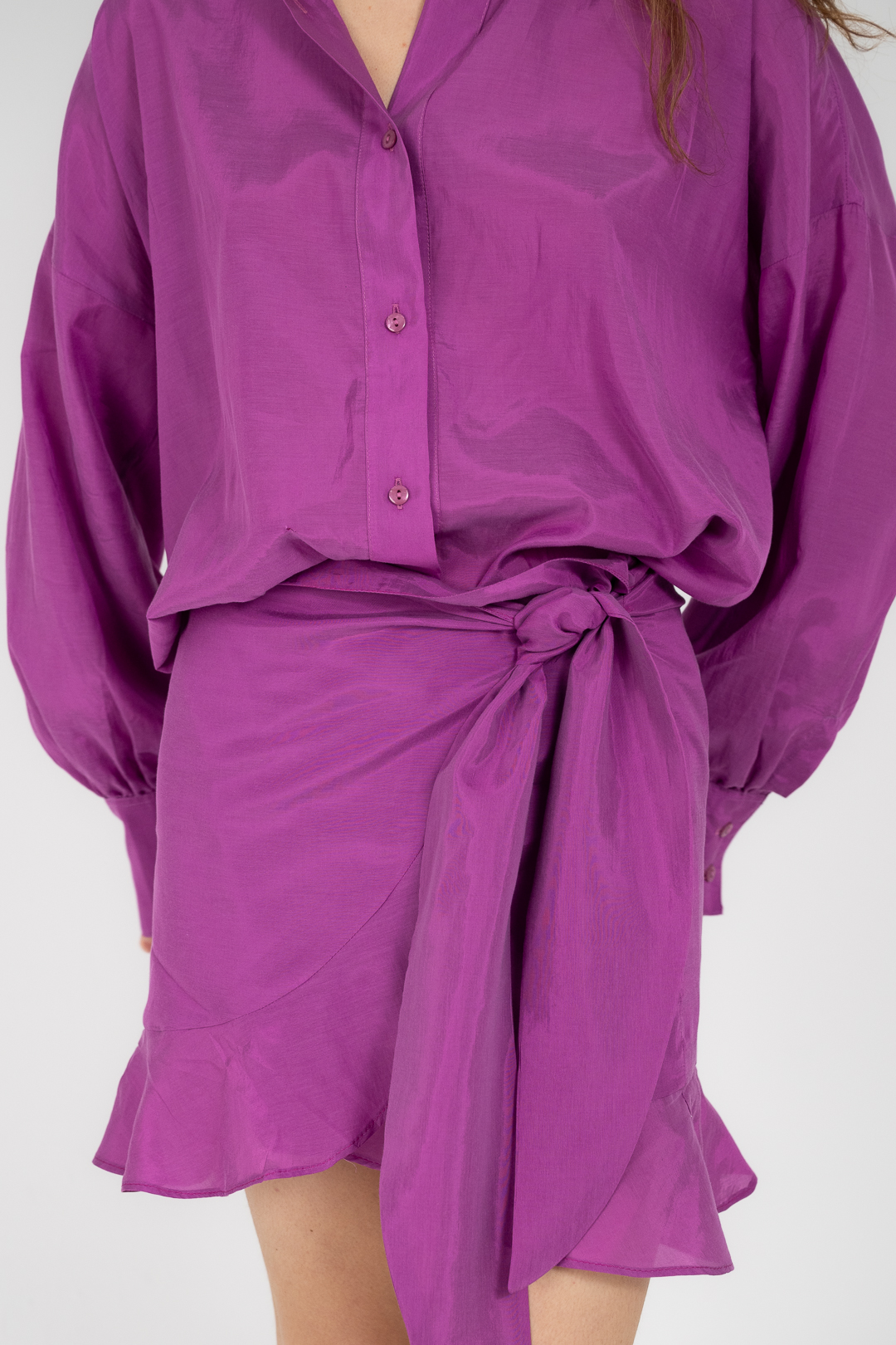 Φούστα με δέσιμο στο πλάι, ασύμμετρο τελείωμα και διακριτικό βολάν που χαρίζει κίνηση σε κάθε βήμα. Προσαρμοσμένη εφαρμογή, ανάλαφρη αίσθηση, φυσική ροή.