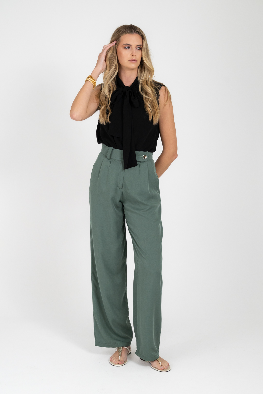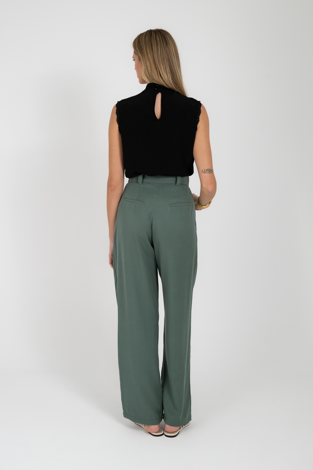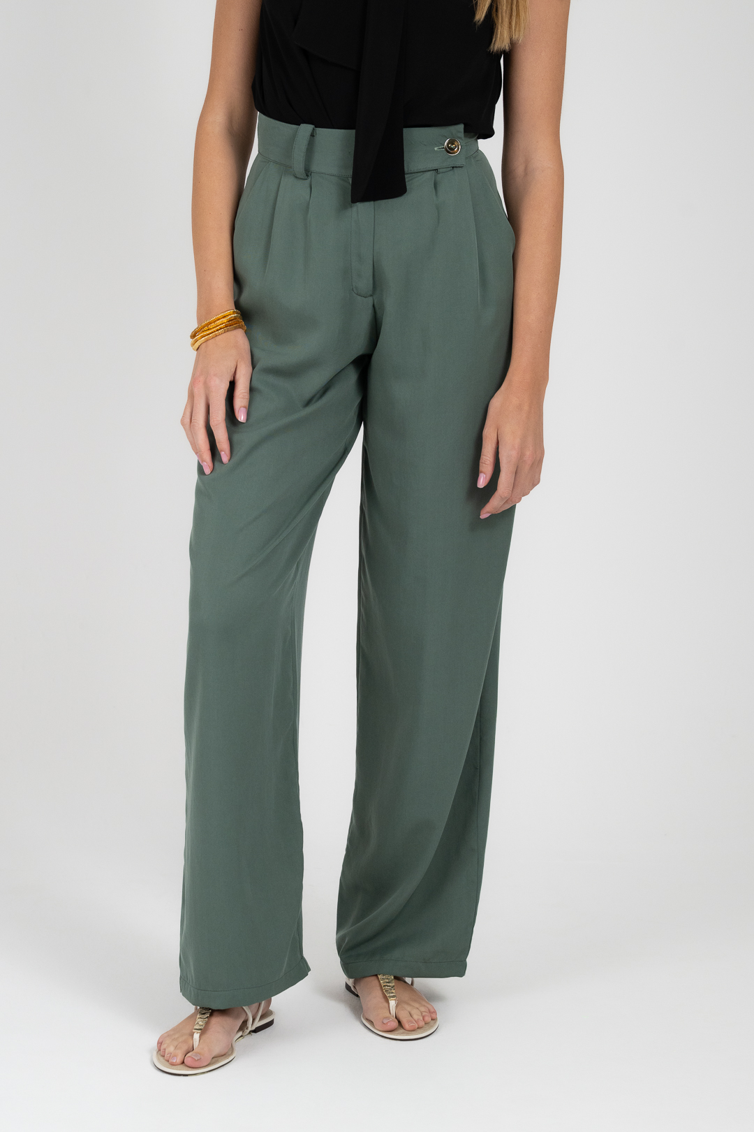 Ψηλόμεσο παντελόνι με πιέτες και ρευστή γραμμή. Ηπια εφαρμογή που προσφέρει άνεση και φυσική κίνηση.